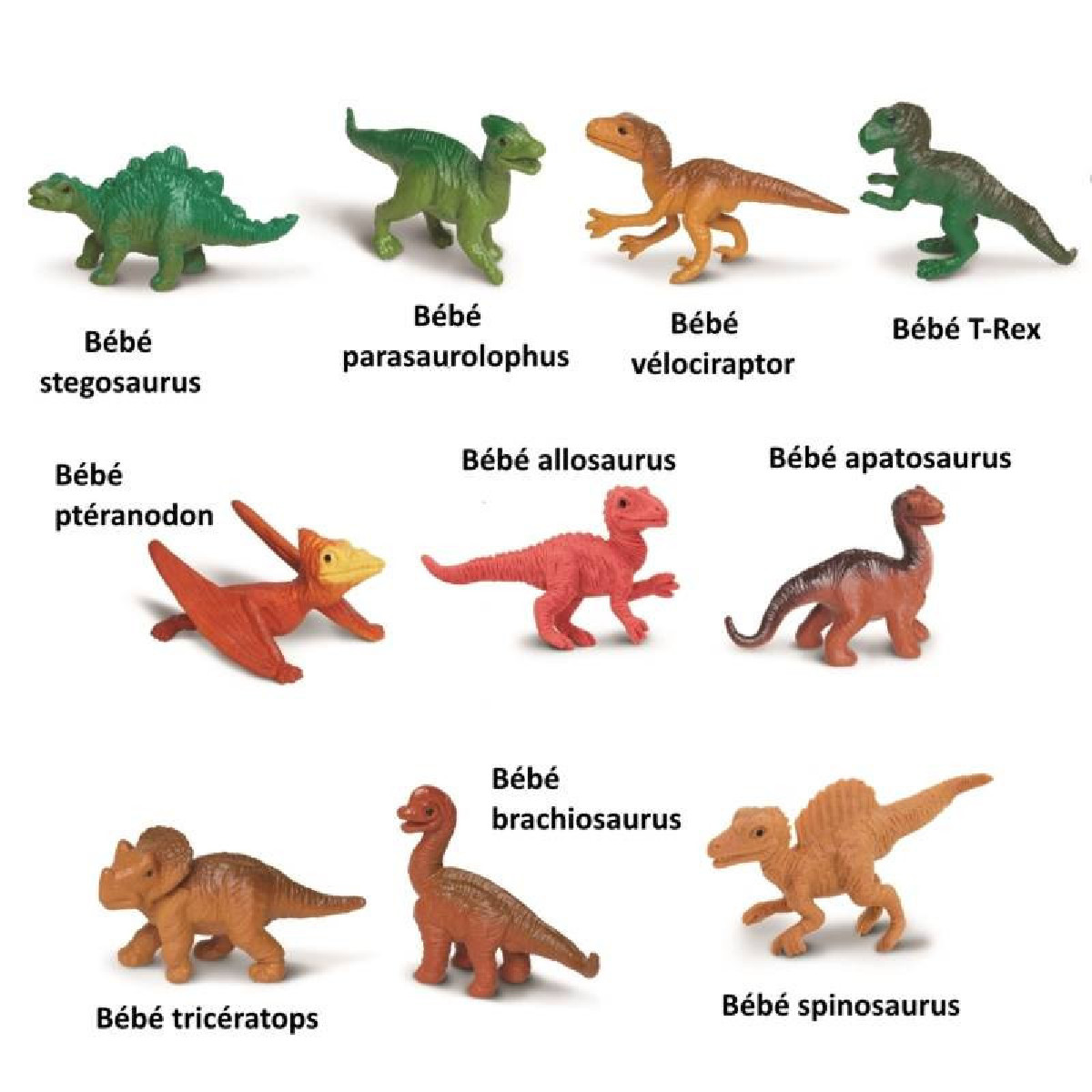 Le stégausorus, le parasaurolophus, le vélociraptor, le T-rex, le ptéranodon, l'allosaurus, l'apatausorus, le tricératops, le brachiosaurus et le spinausorus.