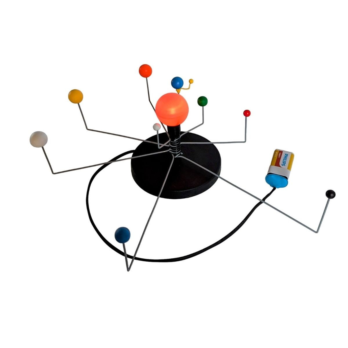 Cette maquette permet de représenter simplement le système solaire. Le Soleil est placé au centre et les planètes tournent autour grâce à un système de bras rotatifs.
