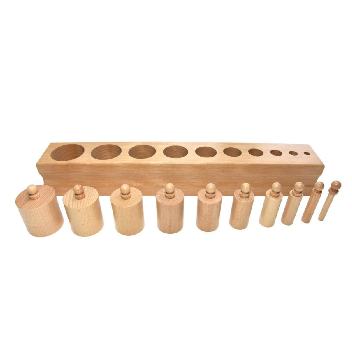 Le bloc de cylindres n°2 est un classique du matériel sensoriel Montessori. Il se compose de 10 cylindres de hauteur identique, mais de diamètres différents.