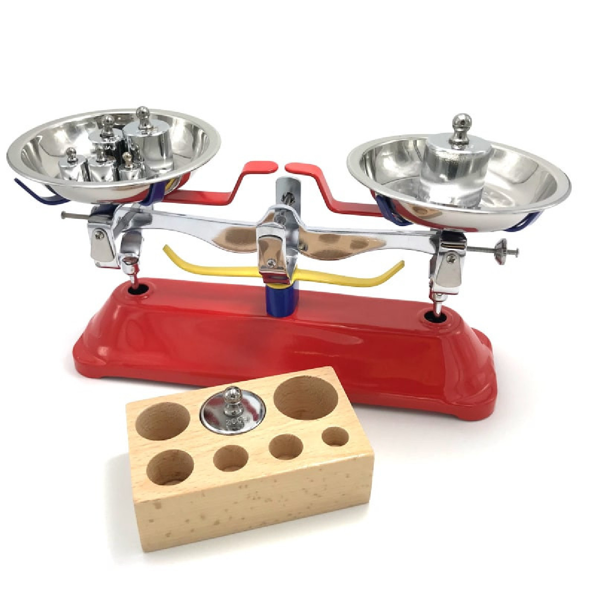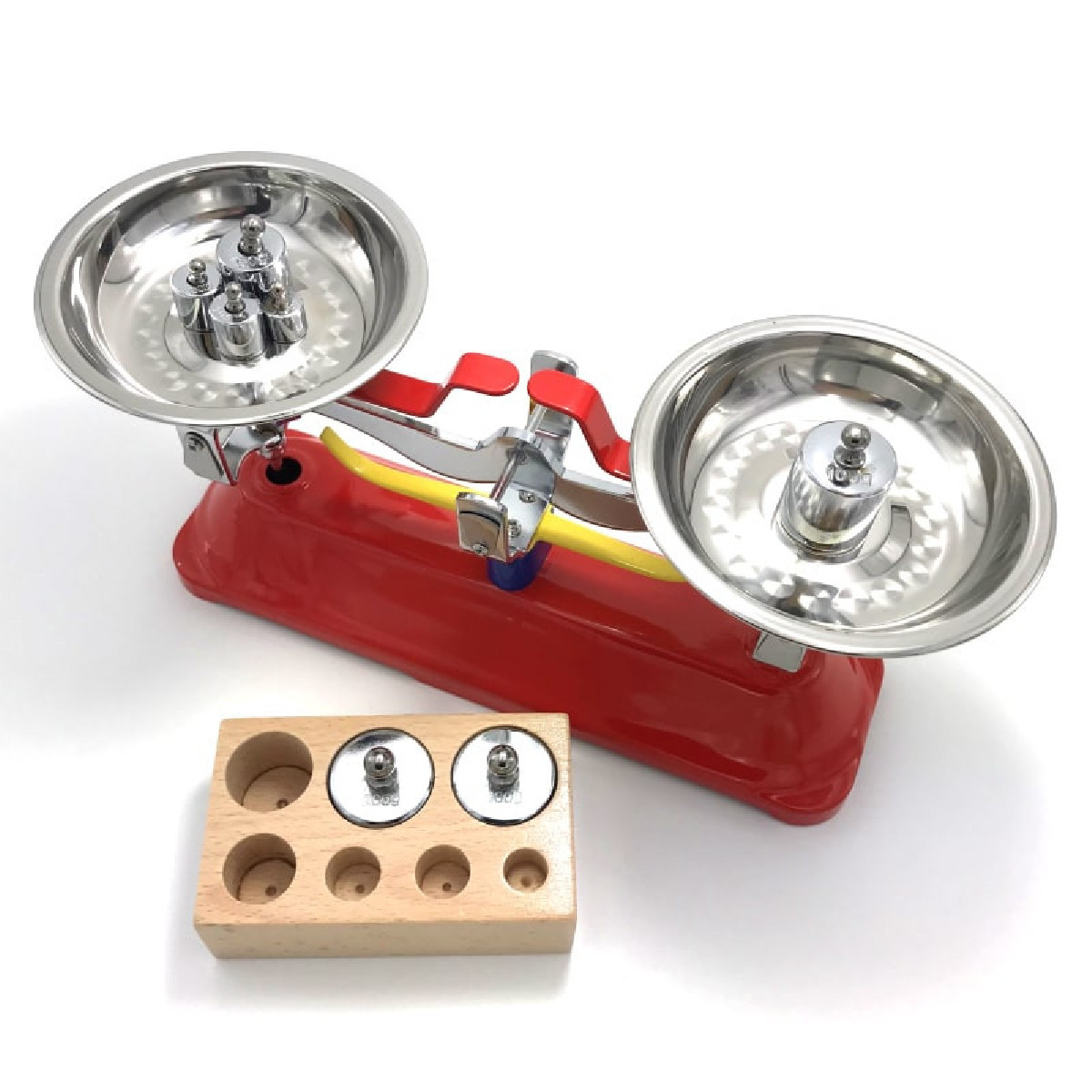 Elle est fournie avec une boite en bois de 7 poids en métal